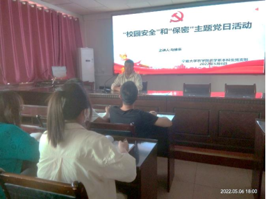 【农学系本科生党支部/来源、马维宗/审核】为进一步贯彻落实保密法治精神,强化保密法治意识和保密常识教育,牢固树立校园安全意识,5月6日下午,农学系本科生党支部于德晖楼423会议室召开“校园安全”和“保密”主题党日活动。此次会议由党支部书记马维宗主持,支部全体党员、预备党员、发展对象及入党积极分子参加。