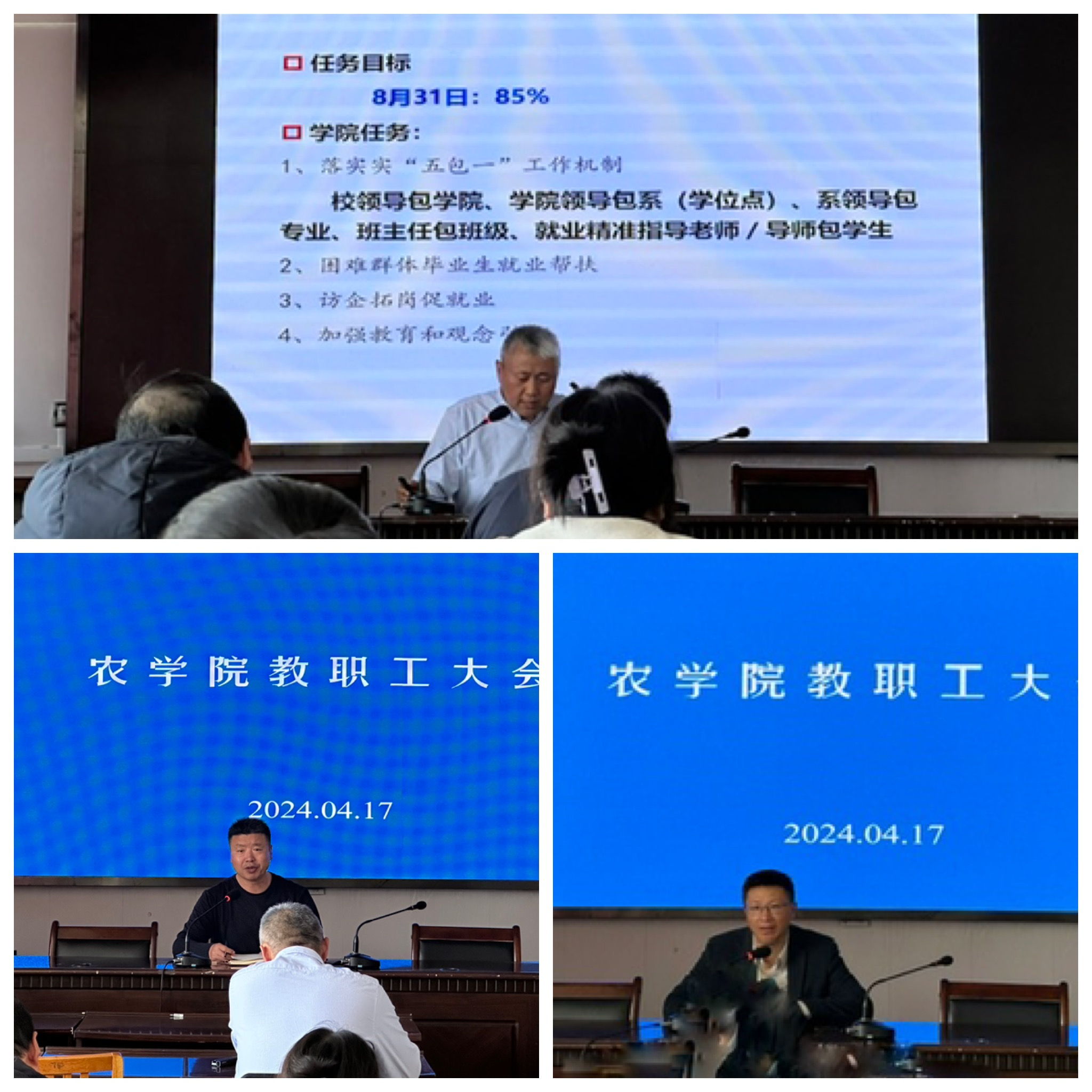 随后,学院召开2024届毕业生就业工作动员部署会。会议传达了学校2023届毕业生就业工作总结暨2024届毕业生就业工作部署会议精神,对做好今年学院毕业生就业工作进行了动员和部署。学院领导通报了今年各专业、各学位点毕业生的基本情况,分析了当前就业形势和所面临的挑战,明确了就业目标、主要任务及工作措施,并对相关政策和工作要求进行了解读。会议要求各位老师要高度重视毕业生就业工作,认真落实“五包一”工作机制,提前行动,做好毕业生就业教育和引导工作,不断开拓就业岗位资源,主动为学生提供精准就业信息和帮扶,推进高质量就业,甘做学生人生发展的灯塔和引路人。