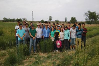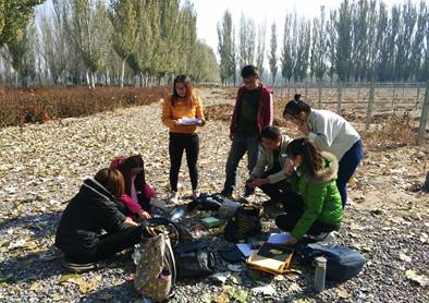 宋丽华教授(左一)带领学生测定适生灌木树种生长状况