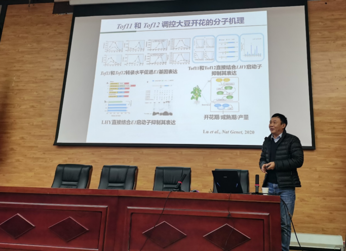 刘宝辉教授首先从重要作物大豆的起源分布和栽培训化引出了光周期调控大豆开花这一主题,然后重点介绍了团队通过定位和克隆多个控制大豆开花期的遗传位点,系统解析了EC复合体蛋白活性成员phyA介导光周期信号控制开花时间的分子机制,从而进一步确立了EC复合体是大豆光周期开花和光周期现象的核心地位。
