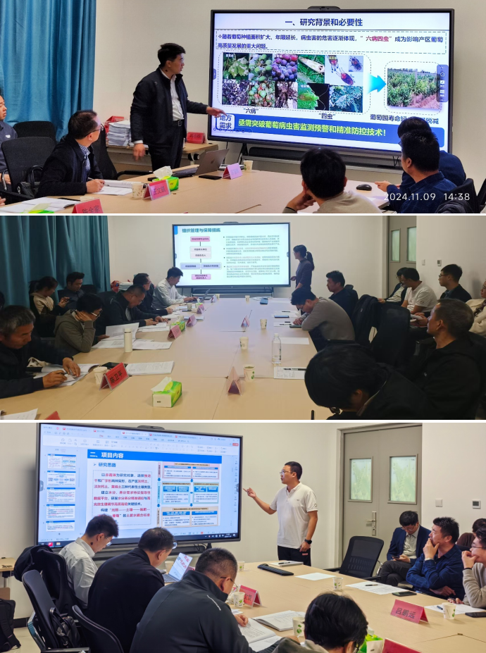 项目负责人苏宝峰教授、贾彦霞教授和王亚麒博士分别汇报了“酿酒葡萄病虫害监测预警关键技术研究与产业化应用”、“ 宁夏冷凉地区十字花科蔬菜主要病虫害监测预警及绿色防控关键技术研究与示范”、“ 贺兰山东麓酿酒葡萄水肥耦合及水分养分精准调控关键技术研究与示范”的主要研究内容、课题设置、实施方案及考核指标等情况。