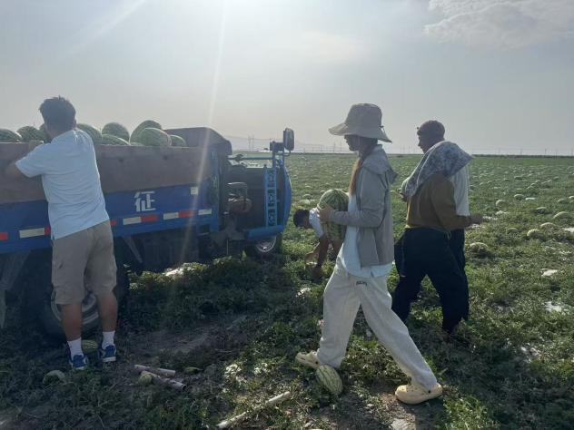 烈日下,实践团队与瓜农共同完成200个硒砂瓜的选瓜、套网、装车工作。吴宏亮教授现场示范“三看两摸”选瓜法:看纹路清晰度、瓜脐形状、瓜蒂新鲜度,摸瓜身硬度与光滑度。学生袁泽明感慨:“从课本到田间,才真正理解了‘知行合一’的分量。”