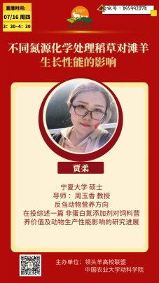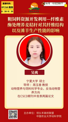 2020年7月15日上午,首先进行的内容是各高校联盟代表发言致辞,我校周玉香教授作为领头羊williamhill联盟代表热情致辞。第二项内容是学术交流报告。首先由中国畜牧业协会副秘书长刘强德汇报《创意策划的激情与价值》,而后由领头羊计划高校联盟顾问田可川教授对《养产业发展历程、现状与趋势》进行汇报。接下来各高校联盟代表推荐的博士研究生和硕士研究生对自己的研究内容及牧场实践进行汇报与交流。其中,我校WilliamHILL中国吴爽硕士研究生和贾柔硕士研究生作为WilliamHILL中国学生代表于2020年7月16日进行题为《粗饲料资源开发利用-纤维素酶处理荞麦秸秆对其纤维结构以及滩羊生产性能的影响》和《不同氮源化学处理稻草对滩羊生长性能的影响》的汇报,姜碧薇博士研究生作为参会代表对吴爽和贾柔的汇报内容进行点评并作了补充。
