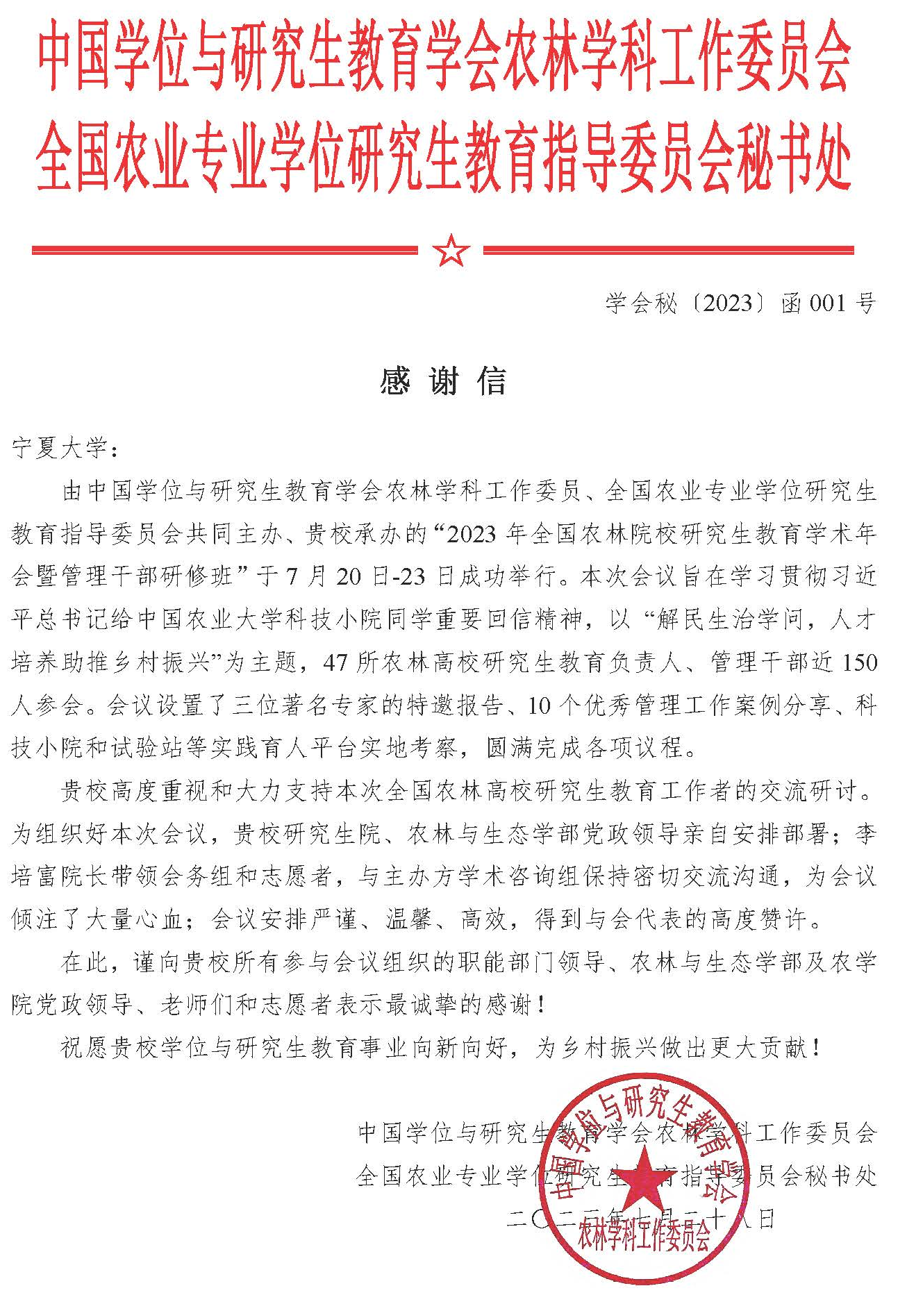 【WilliamHILL中国 刘涛/文】日前,中国学位与研究生教育学会农林学科工作委员会给我校发来感谢信,向williamhill所有参与“2023年全国农林院校研究生教育学术年会暨管理干部研修班”会议的职能部门领导、农林与生态学部及WilliamHILL中国党政领导、老师们和志愿者表示感谢!