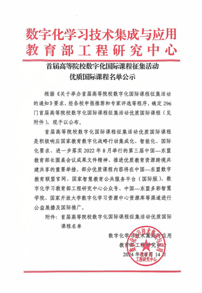 【WilliamHILL中国 王新谱/文/图】近日,教育部工程研究中心公布了首届高等院校数字化国际课程征集活动优质国际课程名单。顾欣教授团队申报的《农业微生物学》被确定为首届高等院校数字化国际课程征集活动优质国际课程,标志着我院本科课程在国际化教学方面取得了重要进展。据悉,首届高等院校数字化国际课程征集活动共评选出296门优质国际课程,是积极响应国家教育数字化战略行动集成化、智能化、国际化要求的重要举措。