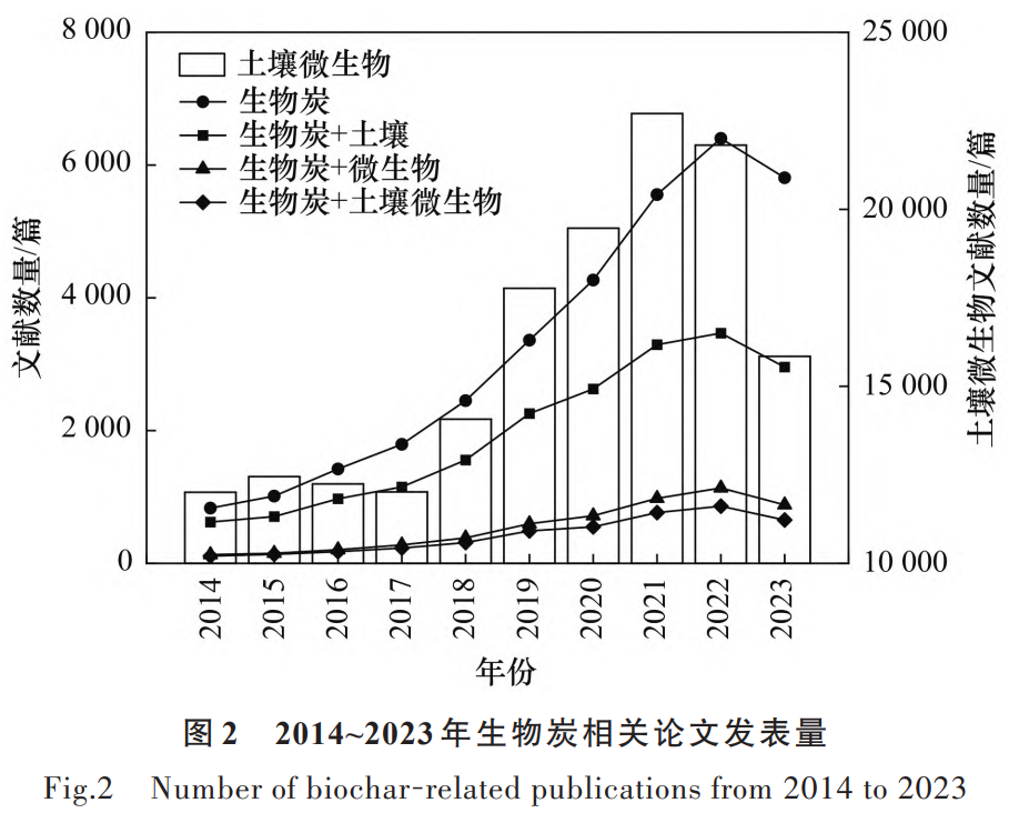 近年来,生物炭相关论文的发表量逐年增加。然而截止2022年,涉及“生物炭+土壤微生物”主题的研究仅占13.46%,在2018~2022年相关研究比例仅为1.75%。