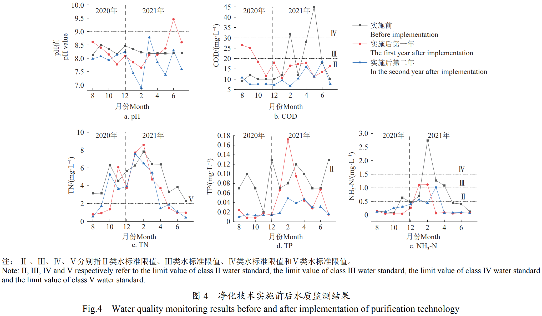 净化技术实施后,水质显著改善:第二年COD、总氮、NH3-N、总磷相对实施前年平均质量浓度分别减少了41.97%、33.27%、56.96%和72.22%;Ⅱ类水月份占比从16.67%升至66.67%,无Ⅴ类水;COD最低达6.74mg/L,总磷多数月份保持在0.008~0.095mg/L,均达Ⅱ类水标准,净化效果逐步稳定。