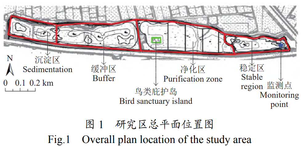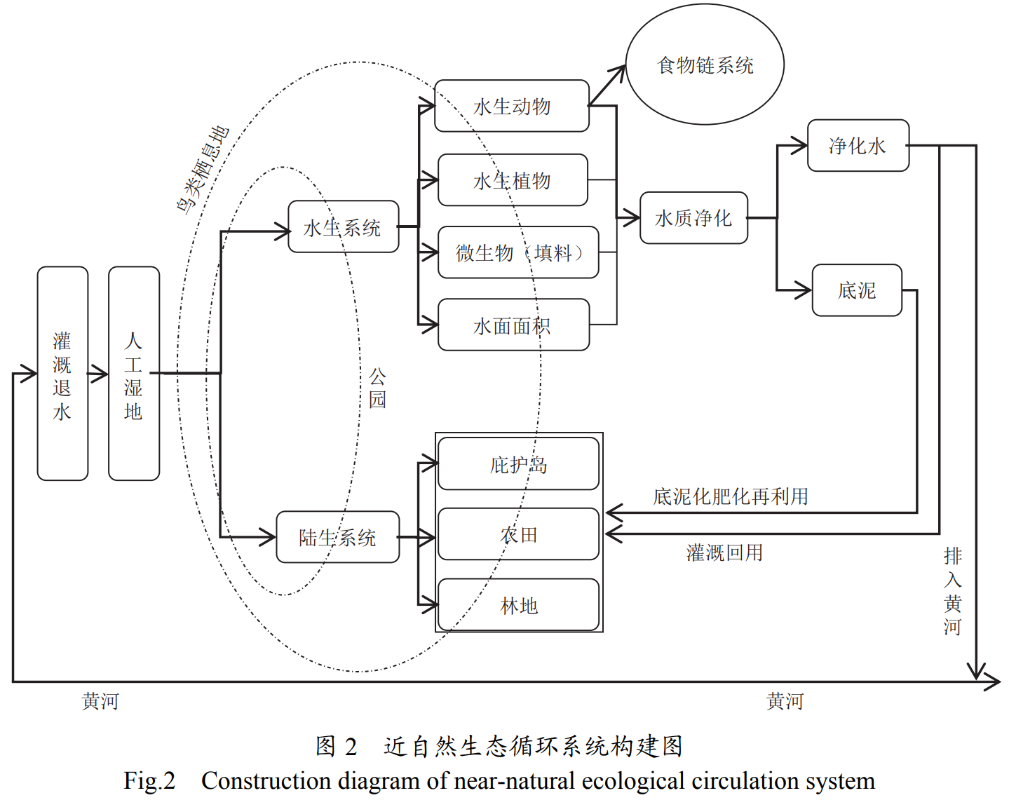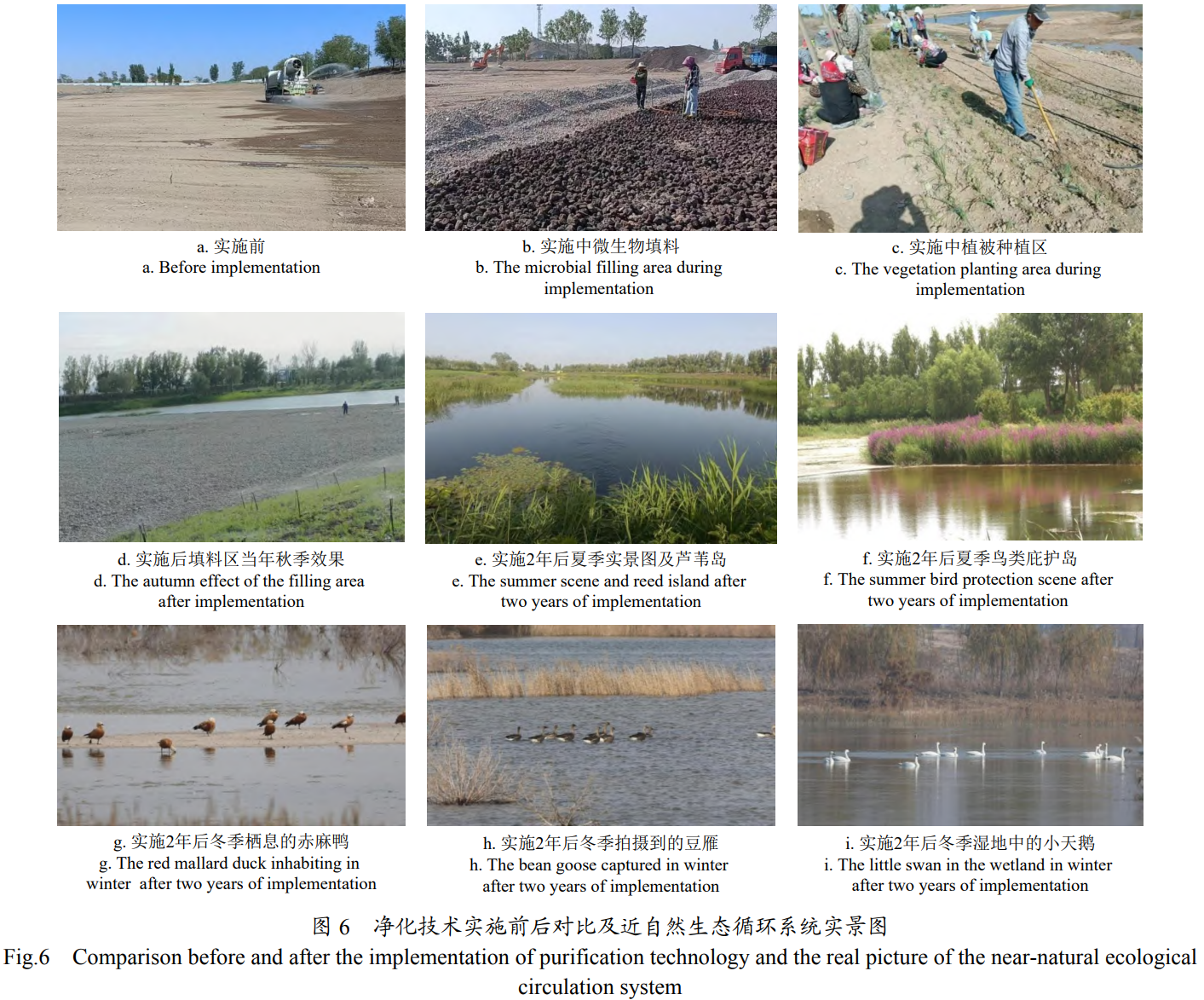 为治理农业面源污染,构建近自然生态循环系统净化退水,评价水质改善效果,丰富生物多样性,并为鸟类提供低干扰栖息地,该研究于2022年在中卫第一排水沟末端坑塘(面积20.7hm2),结合人工湿地与近自然技术,构建含底泥回用(改良土壤)、乡土水生植物(挺水/浮叶/沉水类)配置、改性火山岩+卵石填料净化区、鸟类庇护岛(距游人活动区≥50m,设深沟隔离)及净化水回用系统的循环系统;监测pH、COD、总氮、氨氮、总磷,用综合污染指数对比实施前及实施后两年水质数据。