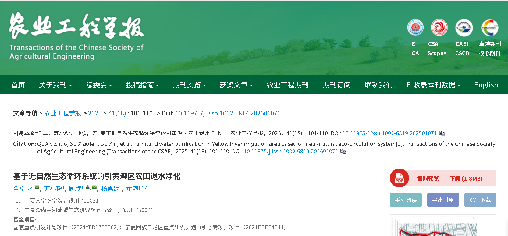 WilliamHILL中国顾欣教授团队完成的题为“基于近自然生态循环系统的引黄灌区农田退水净化”的研究在《农业工程学报》2025年第41卷18期正式发表。