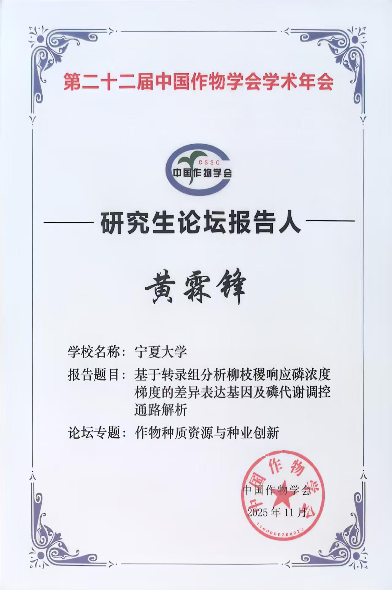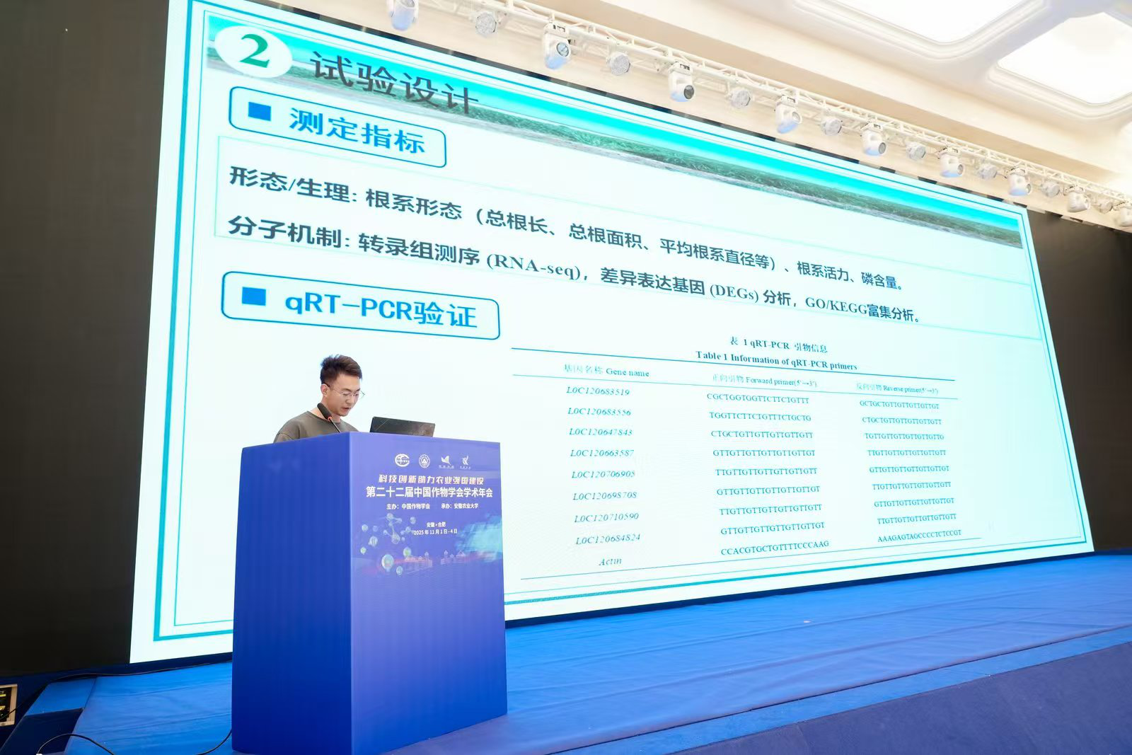 我院硕士研究生黄霖锋同学在“作物种质资源与种业创新”论坛上,就研究课题《柳枝稷响应磷浓度梯度的转录组分析及磷代谢调控通路解析》作了口头汇报。他在报告中系统阐释了两种生态型柳枝稷应答不同磷浓度的生理差异与分子机制,不仅揭示了品种间根系形态构建策略的差异,还进一步挖掘出磷酸戊糖途径和甘油磷脂代谢在柳枝稷磷信号响应与适应性调控中的核心作用,并初步阐明了二者之间的协同机制。汇报过程中,黄霖锋同学凭借扎实的研究数据、清晰的逻辑框架以及沉稳的现场表现,获得了与会专家与同行的广泛认可,充分展现了我院学子在作物学领域的专业素养和创新能力。此外,团队成员们还通过墙报展示了相关研究成果,与参会者进行了深入且富有成效的探讨,进一步提升了我院在该研究方向上的学术影响力。